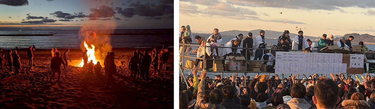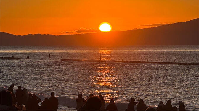会場となった蒲原海岸では、多くの来場者でにぎわうなか、6時から行われた大焚火から始まりました。集まった人々は無料でふるまわれた豚汁で体を温めながら、会場一体となって初日の出を待ちました。天候にも恵まれ、6時54分頃に朝日が昇ると、会場は歓声と新年のあいさつに包まれ、すがすがしい1年の幕開けとなりました。