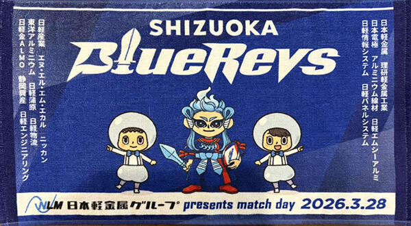 静岡ブルーレヴズのキャラクター「レヴズくん」と、日本軽金属グループのキャラクター「アムル」と「ルミナ」がコラボした限定タオルです。